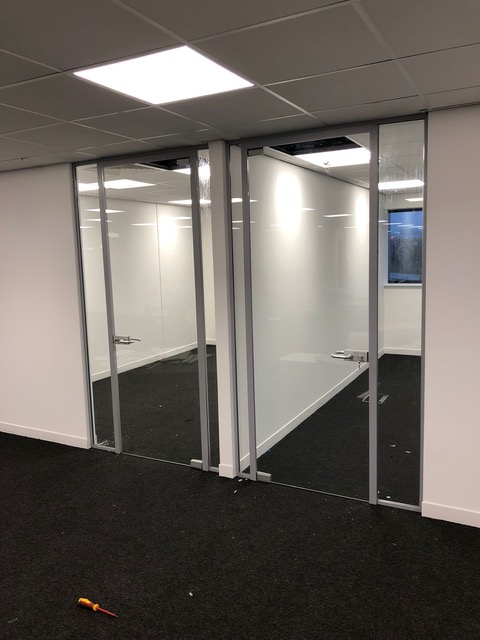 Granmore recently completed this seamless glass installation with glass doors and aluminum door frames for sound transfer reduction. This style also allows daylight to transmit into corridor areas. The solid walls are for sound transfer reduction. Of course, we also do ceiling tiles.