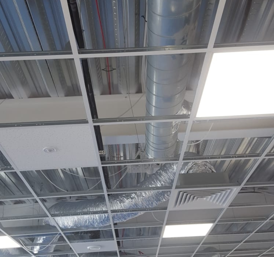 The customer had a small area in which they wanted the above pipes covering up, the area has quite a lot of moisture in it due to the nature of the factory and so the best fit for this was vinyl ceiling tiles and white grid.